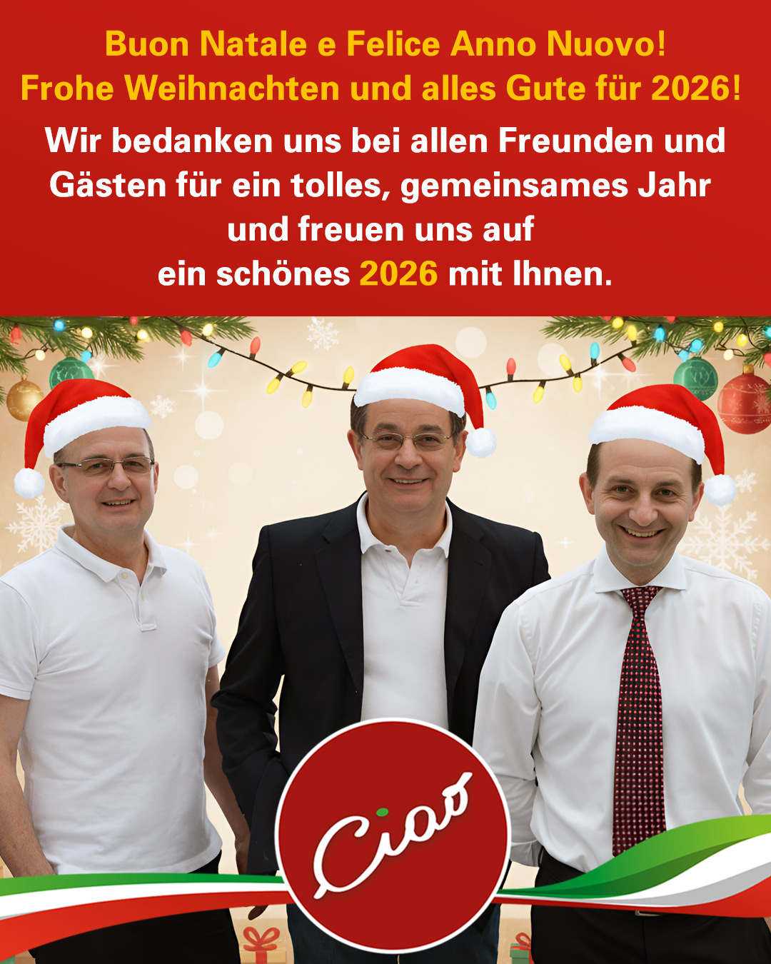 Im Jahr 1982 wurde das familiengeführte Restaurant „Ciao“ von den drei Brüdern Flavio, Alfio und Luca aus der italienischen Provinz Veneto gegründet und ist seitdem in Mörfelden-Walldorf im Stadtteil Walldorf für Sie da. Seien Sie unser Gast und wir bereiten Ihnen einen unvergesslichen Abend. Sie freuen sich auf einen romantischen Abend zu zweit, planen eine Familienfeier oder möchten ein Geschäftsessen organisieren? Wir bieten Ihnen die passende Atmosphäre für jeden Anspruch!